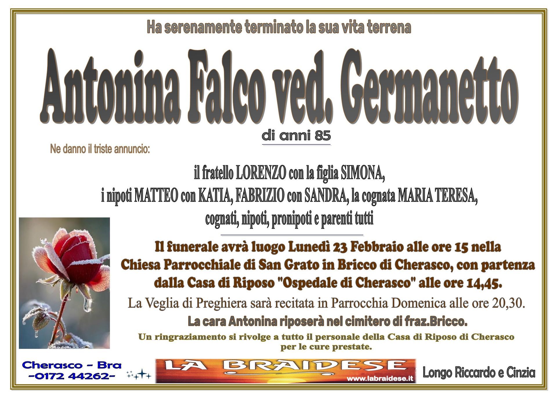 LA BRAIDESE ONORANZE E TRASPORTI FUNEBRI DAL 1965 di Longo Riccardo e C. S.n.c. - P.iva 00493100044 - Privacy Policy - Preferenze Cookie - Sito creato da etinet.it